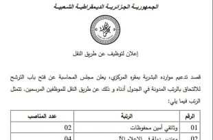قصد تدعيم موارده البشرية بمقره المركزي يعلن مجلس المحاسبة عن فتح باب الترشح للالتحاق بالرتب المبينة ادناه وذلك عن طريق النقل للموظفين المرسمين تتمثل الرتب في التالي ads وثائقي امين محفوظات عدد المناصب 02 مهندس دولة في الاعلام الالي عدد المناصب 04 مهندس دولة …