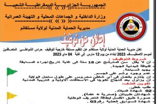 المديرية العامة للحماية المدنية مديرية الحماية المدنية لولاية عنابة اعلان عن توظيف حراس الشواطئ الموسميين ads تنظم مديرية الحماية المدنية لولاية عنابة مسابقة على اساس الانتقاء لتوظيف حراس شواطئ الموسميين لموسم 2023 فعلى الراغبين في المشاركة في هذه المسابقة ايداع ملفاتهم على مستوى مديرية …