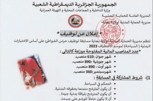 المديرية العامة للحماية المدنية مديرية الحماية المدنية لولاية الجزائر اعلان عن توظيف حراس الشواطئ الموسميين ads تنظم مديرية الحماية المدنية لولاية الجزائر مسابقة على اساس الانتقاء لتوظيف حراس شواطئ الموسميين لموسم 2023 فعلى الراغبين في المشاركة في هذه المسابقة ايداع ملفاتهم على مستوى مديرية …