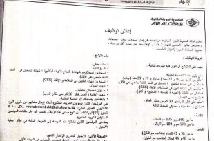 اعلان عن توظيف الخطوط الجوية الجزائرية Air Algérie ads تعلن الخطوط الجوية الجزائرية عن اعلان توظيف في اطار الاستخلاف مؤقت مصرفين ومصرفات شروط الترشح متمكن من اللغات الاجنبية العربية الفرنسية الانجليزية او اكثر متمتع بحسن السلوك مقيم على مستوى مطار الجزائر على الاقل 30كلم …