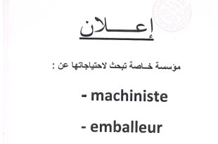 الملحقة المحلية للتشغيل بعين وسارة الجلفة عرض عمل مؤسسة خاصة ads تعلن الملحقة المحلية للتشغيل بعين وسارة عن عرض عمل بمؤسسة خاصة كما هو موضح ادناه الهيئة المستخدمة مؤسسة خاصة المناصب المطلوبة machiniste عدد المناصب: 01 emballeur عدد المناصب: 01 طبيعة العقد : / …
