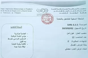 الملحقة المحلية للتشغيل بالنعامة عرض عمل شركة SARL GSS ads تعلن الملحقة المحلية للتشغيل باتنة عن عرض عمل بشركة SARL GSS هو موضح ادناه الهيئة المستخدمة شركة SARL GSS المناصب المطلوبة اعوان امن عدد المناصب: 12 حارس عدد المناصب: 04 طبيعة العقد : // …
