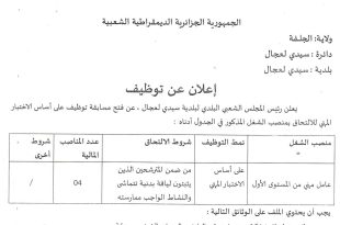 اعلان عن توظيف بلدية سيدي لعجال بولاية الجلفة ads يعلن رئيس المجلس الشعبي البلدي لبلدية سيدي لعجال عن فتح مسابقة توظيف على اساس الاختبار المهني في الرتب المبينة ادناه عامل مهني من المستوى الاول عدد المناصب 04 منصب نمط التوظيف مسابقة على اساس الاختبار …
