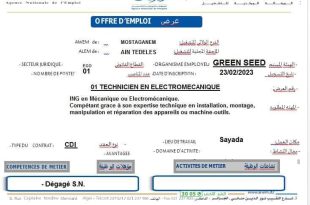 الملحقة المحلية للتشغيل عين تادلس عرض عمل مؤسسة GREEN SEED ads تعلن الملحقة المحلية للتشغيل عين تادلس عن عرض عمل بمؤسسة GREEN SEEDكما هو موضح ادناه الهيئة المستخدمة مؤسسة GREEN SEED المناصب المطلوبة technicien en électromécanique عدد المناصب: 01 طبيعة العقد : عقد عمل …