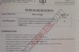 عرض عمل مؤسسة ميناء أرزيو وهران ads تعلن مؤسسة ميناء أرزيو وهران عن فتح توظيف كما هو موضح ادناه الهيئة المستخدمة بمؤسسة ميناء أرزيو وهران المناصب المطلوبة رئيس ميكانكيين عدد المناصب: 12 نوع العقد / مكان العمل وهران القطاع القانوني عمومي تاريخ تسجيل العرض …