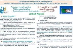 اعلان ads إعلان عن مسابقة توظيف للمعهد المغاربي لتمويل التنمية (IFID) الدفعة 40 – مخصصة لقطاع التأمين فترة التقديم عبر الإنترنت: من 4 مارس 2024 إلى 13 مايو 2024 الموقع الإلكتروني للتقديم: https://www.ifid.org.tn/ تاريخ إجراء الاختبارات المكتوبة: السبت 18 مايو 2024 شروط التقديم: أن …