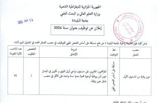 اعلان توظيف الوظيف العمومي ads الولايات المعنية : تيبازة البليدة المدية البويرة سطيف قسنطينة تيزي وزو بجاية قالمة خنشلة المنيعة اولاد جلال سيدي بلعباس وتيارت لمزيد من المعلومات يرجى التقرب من المؤسسة او الإدارة المعنية تاريخ نشر الاعلانات 16 افريل 2024 ملاحظة: يرجى التاكد …