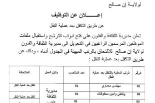 أكمل القراءة »إعلان عن التوظيف عن طريق التكفل بعد عملية النقل مديرية الثقافة والفنون لولاية إن صالح