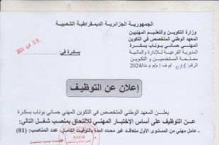 الجمهورية الجزائرية الديمقراطية الشعبية وزارة التكوين والتعليم المهنيين المديرية الفرعية للإدارة والمالية مصلحة المستخدمين والتكوين ads إعلان عن التوظيف المعهد الوطني المتخصص في التكوين المهني حساني بوناب بسكرة يعلن المعهد الوطني المتخصص في التكوين المهني حساني بوناب بسكرة عن التوظيف على أساس الإختبار المهني …