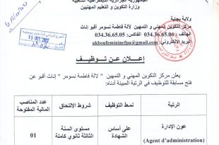 اعلان عن توظيف مركز التكوين المهني والتمهين لالة فاطمة نسومر بجاية CFPA ads تعلن مركز التكوين المهني والتمهين لالة فاطمة نسومر بجاية عن فتح مسابقة توظيف على اساس الشهادة في الرتب المبينة ادناه عون ادارة عدد المناصب 01 منصب نمط التوظيف: مسابقة على اساس …