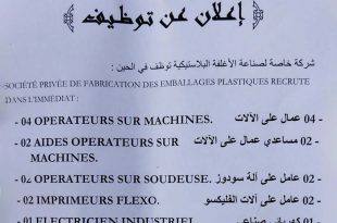 إعلان عن توظيف ads شركة خاصة لصناعة الأغلفة البلاستيكية توظف في الحين : SOCIÉTÉ PRIVÉE DE FABRICATION DES EMBALLAGES PLASTIQUES RECRUTE DANS L’IMMÉDIAT: 04 عمال على الآلات OPERATEURS SUR MACHINES 02 مساعدي عمال على الآلات AIDES OPERATEURS SUR MACHINES 02 عامل على آلة سودوز …