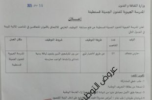وزارة الثقافة والفنون المدرسة الجهوية للفنون الجميلة قسنطينة ads إعلان تعلن المدرسة الجهوية للفنون الجميلة قسنطينة عن فتح مسابقة التوظيف الخارجي للالتحاق بالأعوان المتعاقدين في المناصب المالية المبينة في الجدول التالي: الرتبعدد المناصبطريقة التوظيفشروط التوظيفمكان العملحارس متعاقد01عن طريق الاختيـارمن بين المترشحين الذين يثبتون لياقة …