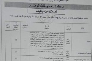 اعلان عن توظيف مركز المحفوظات الوطنية ads يعلن مركز المحفوظات الوطنية عن فتح مسابقة توظيف في الرتب المبينة ادناه متصرف عدد المناصب 02 منصب نمط التوظيف: على اساس الاختبار الحائزون على شهادة ليسانس في التعليم العالي أو شهادة معادلة لها في الميادين والتخصصا ت …
