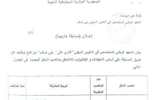 اعلان عن توظيف المعهد الوطني المتخصص في التكوين المهني بن سعيدي عبد العاطي ولاية البيض ads يعلن المعهد الوطني المتخصص في التكوين المهني بن سعيدي عبد العاطي ولاية البيض عن فتح مسابقة توظيف في الرتب المبينة ادناه مساعد التكوين عدد المناصب 01 منصب نمط …