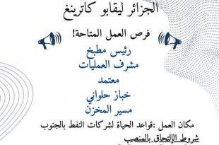 الجزائر ليقابو كاترينغفرص العمل المتاحة! ads رئيس مطبخ مشرف العملياتمعتمدخباز حلواني مسير المخزن مكان العمل : قواعد الحياة لشركات النفط بالجنوبشروط الإلتحاق بالمنصيب شهادة في التخصص المطلوب – الخبرة المطلوبة 05 سنوات او اكثر – القدرة على التنقل والسفر – الاتاحة الفورية.للترشح يرجي ارسال …