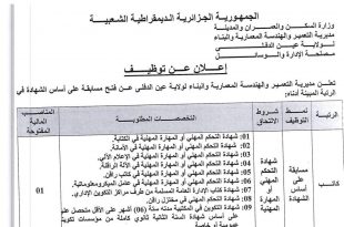 اعلان عن توظيف مديرية التعمير والهندسة المعمارية والبناء لولاية عين الدفلى ads يعلن مديرية التعمير والهندسة المعمارية والبناء لولاية عين الدفلى عن فتح مسابقة توظيف في الرتب المبينة ادناه كاتب عدد المناصب 01 منصب نمط التوظيف: على اساس الشهادة ملف المسابقة على أساس الشهادة …