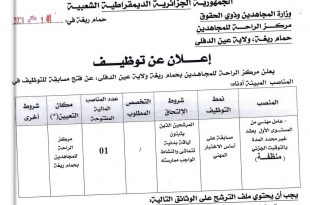 اعلان عن توظيف مركز الراحة للمجاهدين بحمام ريغة لولاية عين الدفلى ads يعلن مركز الراحة للمجاهدين بحمام ريغة لولاية عين الدفلى عن فتح مسابقة توظيف في الرتب المبينة ادناه عامل مهني من المستوى الاول بعقد غير محدد المدة بالتوقيت الجزئي عدد المناصب 01 منصب …