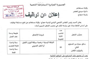 اعلان عن توظيف بلدية الحجاج ولاية مستغانم ads يعلن رئيس المجلس الشعبي البلدي لبلدية الحجاج ولاية مستغانم عن فتح مسابقة توظيف في الرتب المبينة ادناه سائق سيارة من المستوى الثاني عدد المناصب 01 منصب نمط التوظيف: على اساس الانتقاء تاريخ نشر الاعلان: 21 جانفي …