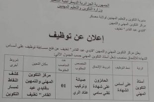 أكمل القراءة »اعلان عن توظيف بمركز التكوين المهني والتمهين قايدي عبد القادر تغنيف معسكر