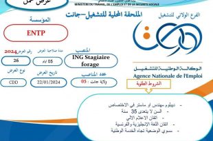 الفرع الولائي للتشغيل جانت الملحقة المحلية للتشغيل جانت عرض عمل المؤسسة الوطنية للأشغال في الآبار ENTP ads تعلن الملحقة المحلية للتشغيل جانت عن عرض عمل باعلان توظيف بالمؤسسة الوطنية للأشغال في الآبار ENTP كما هو موضح ادناه الهيئة المستخدمة: اعلان توظيف بالمؤسسة الوطنية للأشغال …