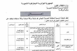 اعلان عن توظيف المكتبة الرئيسية للمطالعة العمومية التيجاني محمد ورقلة ads تعلن المكتبة الرئيسية للمطالعة العمومية التيجاني محمد ورقلة عن فتح مسابقة توظيف في الرتب المبينة ادناه كاتب عدد المناصب 02 منصب نمط التوظيف: على اساس الاختبار المهني عون حفظ البيانات عدد المناصب 04 …
