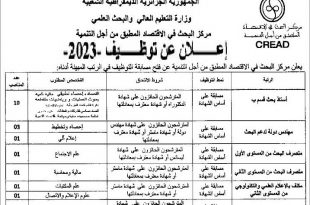 اعلان عن توظيف مركز البحث في الاقتصاد المطبق من اجل التنمية CREAD ads يعلن مركز البحث في الاقتصاد المطبق من اجل التنمية CREAD عن فتح مسابقة توظيف في الرتب المبينة ادناه استاذ بحث قسم ب عدد المناصب 10 منصب نمط التوظيف: على اساس الشهادة …