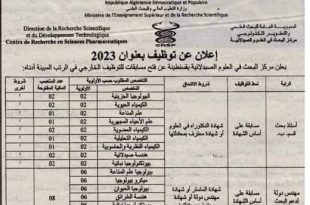 اعلان عن توظيف مركز البحث في العلوم الصيدلانية بقسنطينة ads يعلن مركز البحث في العلوم الصيدلانية بقسنطينة عن فتح مسابقة توظيف في الرتب المبينة ادناه استاذ بحث قسم ب عدد المناصب 14 منصب نمط التوظيف: مسابقة على اساس الشهادة مهندس دولة لدعم البحث عدد …