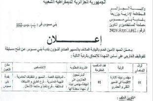اعلان عن توظيف بلدية بني مسوس ولاية الجزائر العاصمة ads تعلن بلدية بني مسوس عن فتح مسابقة توظيف في الرتب المبينة ادناه مهندس دولة للادارةاقليمية في التسيير التقني والحضري عدد المناصب 01 منصب نمط التوظيف: مسابقة على اساس الشهادة ملف المسابقة على أساس الشهادة …