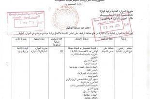 اعلان عن توظيف مديرية الموارد المائية لولاية تيبازة ads تعلن مديرية الموارد المائية لولاية تيبازة عن فتح مسابقة توظيف في الرتب المبينة ادناه مهندس رئيسي في الموارد المائية عدد المناصب 01 منصب نمط التوظيف: مسابقة على اساس الشهادة ملف المسابقة على أساس الشهادة طلب …