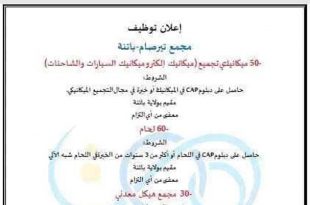 ads إعلان توظيفمجمع تبرصام باتنة-50 ميكانيلي تجميع (ميكانيك الكتروميكانيك السيارات والشاحنات)الشروطحاصل على دبلوم CAP في الميكانيك أو خبرة في مجال التجميع الميكانيكيمقيم بولاية باتنةمعفى من أي التزام-60 لحامالشروطحاصل على دبلوم CAP في اللحام أو أكثر من 3 سنوات من الخبرة في اللحام شبه الآليمقيم …