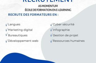 EURL AS Momentum, établissement de formation spécialisé en e-learning recrute des formateurs enLanguesMarketing digitalBureautiquesDéveloppement webCyber sécuritéInfographieGestion de projetRessources humainesOn accepte des propositions dans d’autres domaines de formations.veuillez nous envoyer vos CV par E-mail :[email protected]