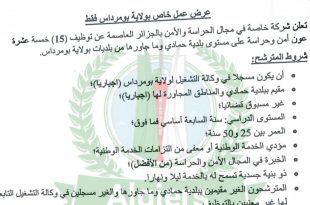 تعلن شركة خاصة في مجال الحراسة والأمن بالجزائر العاصمة عن توظيف (15) خمسة عشرةعون أمن وحراسة على مستوى بلدية حمادي وما جاورها من بلديات بولاية بومرداس ads شروط المترشح: أن يكون مسجلا في وكالة التشغيل لولاية بومرداس (اجباريا)؛ مقيم ببلدية حمادي والمناطق المجاورة لها …