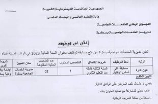أكمل القراءة »اعلان عن توظيف بمديرية الخدمات الجامعية لولاية بسكرة