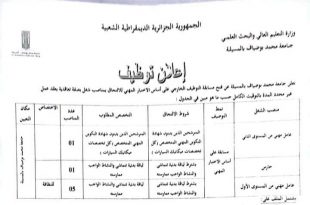 اعلان عن توظيف مديرية التربية لولاية اولاد جلال ads تعلن مديرية التربية لولاية اولاد جلال عن فتح مسابقة توظيف في الرتب المبينة ادناه ملحق بالمخبر عدد المناصب 02 منصب نمط التوظيف: مسابقة على اساس الشهادة ملف المسابقة على أساس الشهادة طلب خطي يتم تضمين …