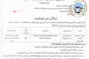 أكمل القراءة »اعلان عن توظيف بالمؤسسة العمومية الاستشفائية الشهيد حمادو حسين سيدي علي ولاية مستغانم