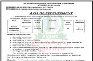 اعلان عن توظيف المؤسسة العمومية الاستشفائية حجوط تيبازة ads تعلن المؤسسة العمومية الاستشفائية حجوط تيبازة فتح مسابقة توظيف في الرتب المبينة ادناه طبيب عام في الصحة العمومية عدد المناصب 02 منصب نمط التوظيف: مسابقة على اساس الشهادة ملف المسابقة على أساس الشهادة طلب خطي …