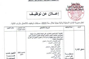 اعلان عن توظيف مديرية الادارة المحلية لولاية بجاية ads تعلن مديرية الادارة المحلية لولاية بجاية عن فتح مسابقة توظيف في الرتب المبينة ادناه ملحق ادارة عدد المناصب 02 منصب نمط التوظيف: مسابقة على اساس الشهادة عون ادارة رئيسي عدد المناصب 03 منصب نمط التوظيف: …