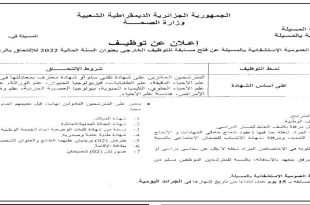 اعلان عن توظيف المؤسسة العمومية الاستشفائية بالمسيلة ads تعلن المؤسسة العمومية الاستشفائية بالمسيلة عن فتح مسابقة توظيف على اساس الشهادة في الرتب المبينة ادناه ملحق بالمخبر للصحة العمومية عدد المناصب 02 منصب نمط التوظيف مسابقة على اساس الشهادة ملف المسابقة على أساس الشهادة طلب …