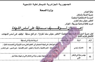 أكمل القراءة »اعلان عن توظيف بالمؤسسة الاستشفائية المختصة الدكتور معوش محند امقران بالجزائر العاصمة