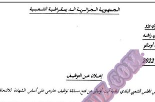 أكمل القراءة »اعلان عن توظيف بالمجلس الشعبي البلدي لبليدة ايت اومالو تيزي وزو