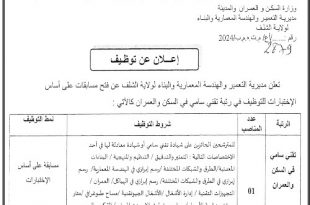 إعلان عن توظيف بمديرية التعمير والهندسة المعمارية والبناء لولاية الشلف
