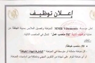 إعلان توظيف ads تعلن مؤسسة MMB Vetements للخياطة وتفصيل الملابس بمدينة الجلفة عن عملية توظيف ثانية بـ 54 منصب عمل تتمثل في المناصب التالية: إناث: 50 منصب خياطة. كل خياطة متمكنة أو متوسطة في الخياطة “لا يشترط شهادة الخياطة” أو أي خياطة تتوفر على …