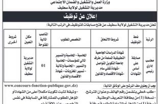 الجمهورية الجزائرية الديمقراطية الشعبية وزارة العمل والتشغيل والضمان الاجتماعي مديرية التشغيل لولاية سطيف ads إعلان عن توظيف تعلن مديرية التشغيل لولاية سطيف عن فتح مسابقات للتوظيف في الرتب التالية: الرتبةنمط التوظيفعدد المناصبالتخصصالشروط الأخرىمكان التعيينمحاسب اداري رئيسيمسابقة على أساس الشهادات01المحاسبة – المحاسبة والتسيير المالي للمؤسسات …