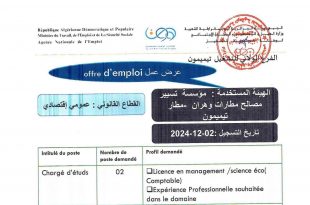 الجمهورية الجزائرية الديمقراطية الشعبية وزارة العمل، التشغيل والضمان الاجتماعي الوكالة الوطنية للتشغيل تيميمون ads عرض عمل الهيئة المستخدمة: مؤسسة تسيير مصالح مطارات وهران – مطار تيميمون القطاع القانوني: عمومي اقتصادي تاريخ التسجيل: 02-12-2024 عرض عمل خاص بمؤسسة تسيير مطارات وهران على مستوى الملاحق المحلية …