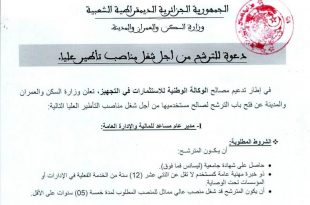 الجمهورية الجزائرية الديمقراطية الشعبية وزارة السكن والعمران والمدينة ads دعوة للترشح من أجل شغل مناصب تأطير عليا في إطار تدعيم مصالح الوكالة الوطنية للاستثمارات في التجهيز، تعلن وزارة السكن والعمران والمدينة عن فتح باب الترشح لصالح مستخدميها من أجل شغل مناصب التأطير العليا التالية: …