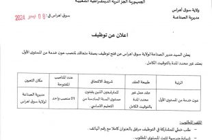 الجمهورية الجزائرية الديمقراطية الشعبية ولاية سوق أهراس مديرية الصناعة ads سوق أهراس في: 08 ديسمبر 2024 إعلان عن توظيف يعلن السيد مدير الصناعة لولاية سوق أهراس عن فتح توظيف بصفة متعاقد لمنصب عون خدمة من المستوى الأول بعقد غير محدد المدة بالتوقيت الكامل. عدد …