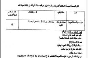 اعلان توظيف المؤسسة العمومية الاستشفائية البيض اكتوبر 2019 يعلن السيد مدير المؤسسة العمومية الاستشفائية بالابيض سيدي الشيخ عن فتح مسابقة للتوظيف في الرتب المبينة ادناه طبيب عام في الصحة الجوارية نمط التوظيف مسابقة على اساس الشهادة شروط الالتحاق شهادة دكتور في الطب او شهادة …