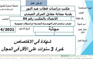 مكتب إستشاري يبحث لصالح شركة أجنبية : ads -مهندس في الهندسة المتجددة (لم أسمع بهذا التخصص من قبل)-مهندس في الكهرباء-مهندس في الكهروتقني-مهندس في الهيدروليك، الهندسة المدنية-مختصين في الموارد البشرية و المالية-مهندس لوجيستيكيرجى الإتصال برقم الهاتف المدون في الصورة المرفقة