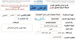 الجمهورية الجزائرية الديمقراطية الشعبية وزارة العمل والتشغيل والضمان الاجتماعي الوكالة الوطنية للتشغيل ads الموضوع: في عرض عمل عن طريق التعويض المرجع: عرض عمل شركة أربيك الجزائر للمقاولات ش.د.م.م تبعا لعرض عمل شركة أربيك الجزائر للمقاولات ش.د.م.م المؤرخ في 2024/12/29 المودع لدى مصالحنا بتاريخ 2024/12/29 …