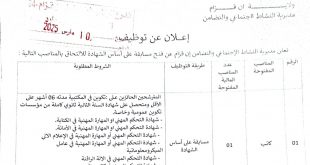 أكمل القراءة »إعلان عن توظيف في مديرية النشاط الاجتماعي والتضامن